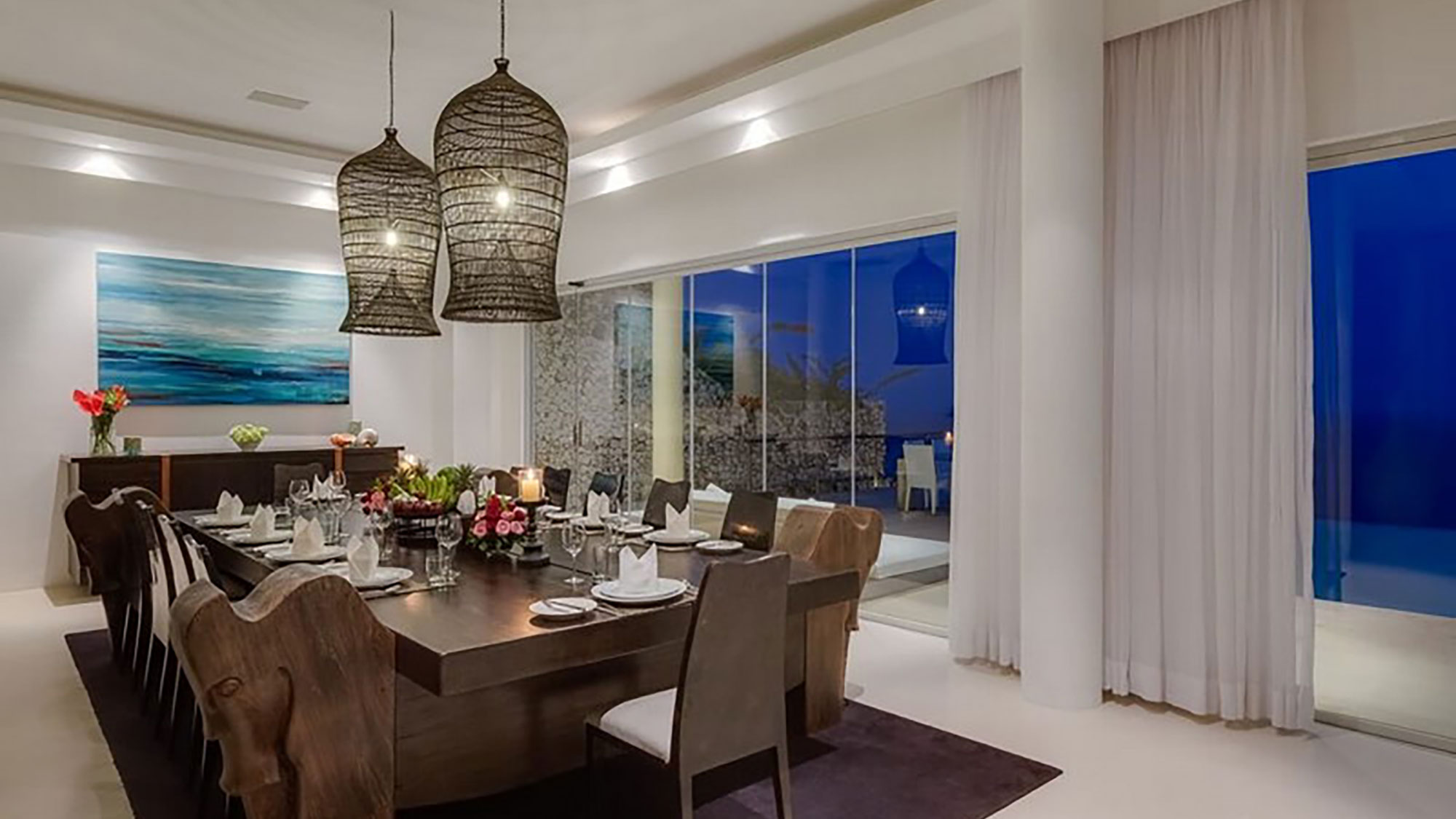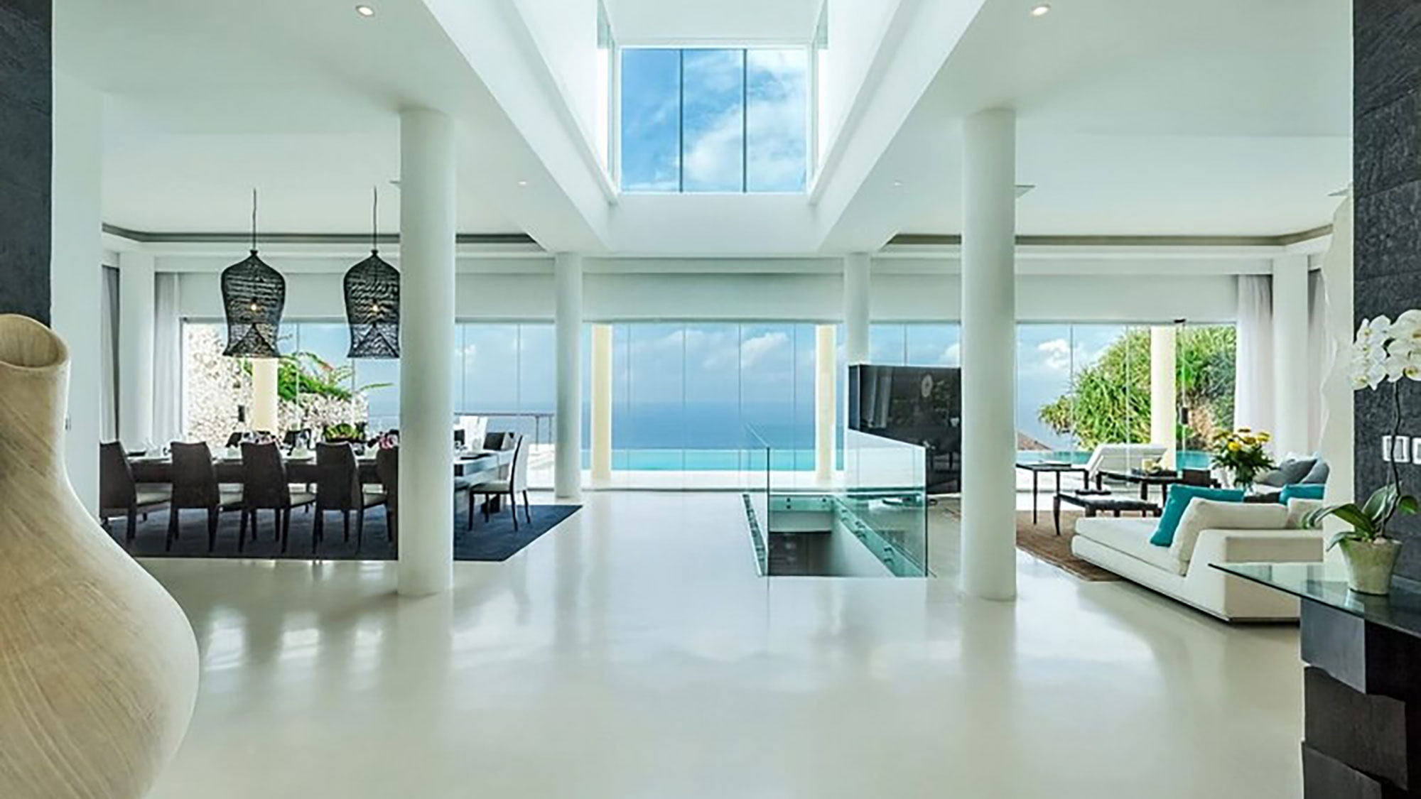 Grand Cliff Ungasans entrance door opens onto the villas middle level, which is its social hub and home to an expansive glass-fronted living and dining room that spills out onto the sheltered pool terrace. The air-conditioned living area features a bar and a comfy modular sofa positioned around a large international-channel TV complete with a Blu-ray DVD player. A dining table for 12 dominates one side of the room, and is perfect for a social dinner.