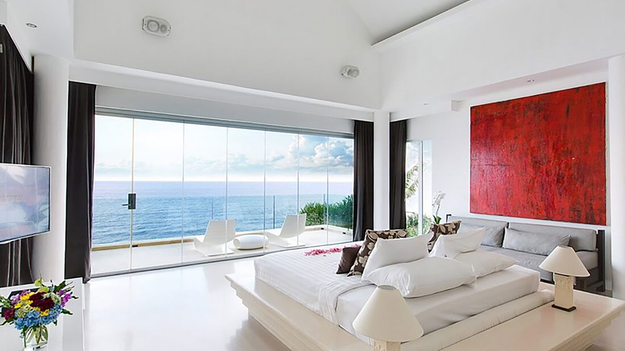 The villas two air-conditioned master suites are situated on the upper floor, both with walk-through dressing rooms, TVs, and office areas. Each of these bedrooms is a dream in white, ensuring that nothing detracts from the spectacular views of the ocean from the king-size beds. Glass doors open to private balconies furnished with funky chairs. Each master suite features a sophisticated black tiled bathroom with twin washbasins, a soaking tub and a walk-in rain shower.
